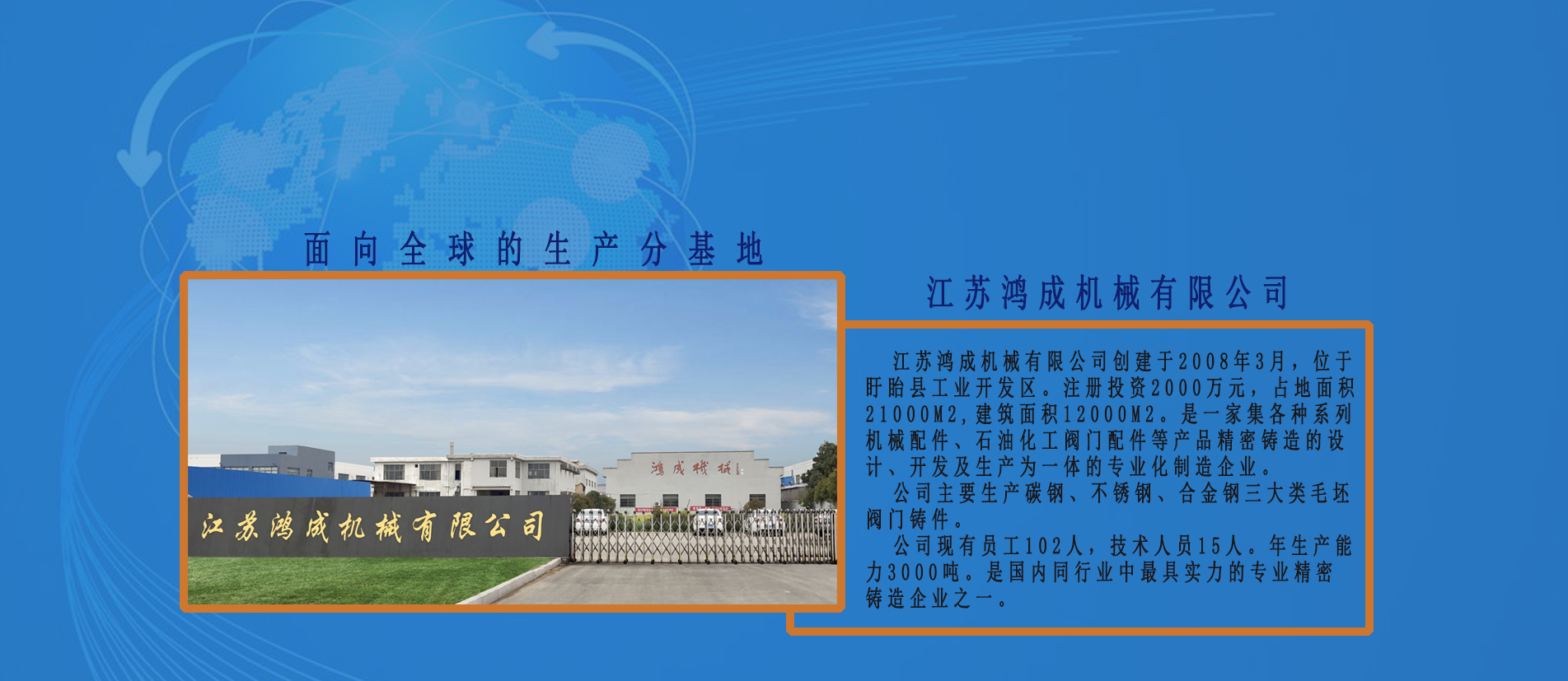 成立于江蘇程投資2008,占地面積25000 m2專業(yè)生產(chǎn)超過DN200口徑,體重超過150公斤。